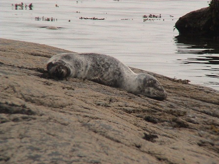 We first saw a pup I later thought must have been Silver - on July 7th 2005, lying asleep alone on the haul-out rocks at Minerstown. Howver, he appeared to be a healthy size and did not appear to be distressed, so we left him alone, hoping that his mother would return.